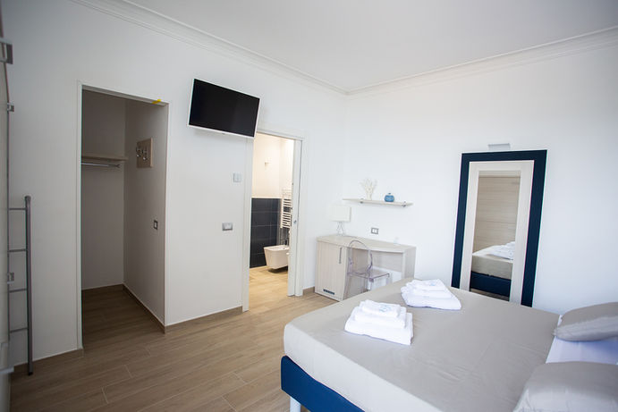 Dispone di un letto matrimoniale e un letto a castello e cabina armadio oltre a un balcone adiacente alla camera che permette di godere di una splendida vista mozzafiato sul mare e sulla costa.